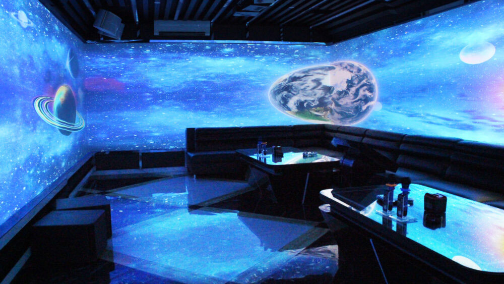 包廂墻面可以投影出各種主題的場景,模擬海洋、森林、草原、宇宙等多種場景,打破了傳統(tǒng)KTV包間像是簡單的一面墻,一部電視,配合有色調單一的激光燈,千篇一律,實現了柔性裝修。
