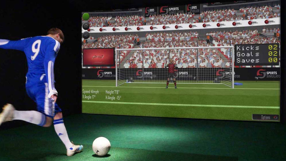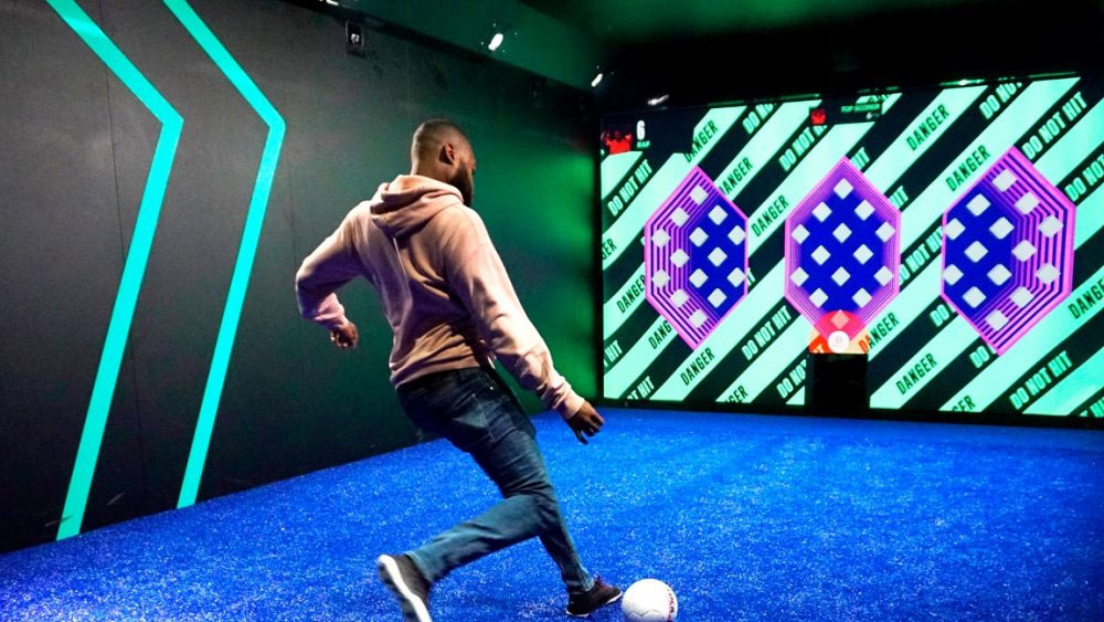 互動(dòng)投影虛擬足球,運(yùn)用空間交互技術(shù),模擬真實(shí)的足球運(yùn)動(dòng)特性研發(fā),將一個(gè)立體空間打造成虛擬現(xiàn)實(shí)的足球功能區(qū),實(shí)現(xiàn)玩家在虛擬環(huán)境下的射門體驗(yàn)。
