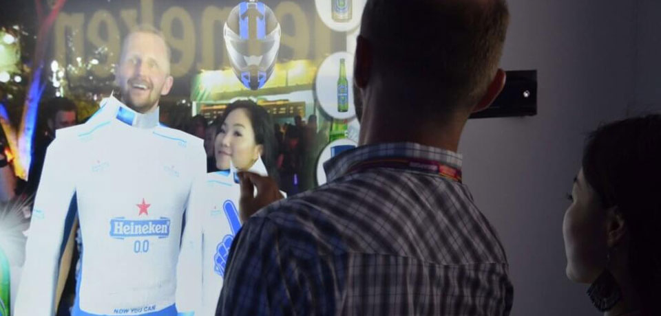 拍照者走進(jìn)拍照區(qū)域內(nèi),系統(tǒng)通過攝像頭捕捉人的肢體語言,此時,拍照者會看見自己的影像已經(jīng)被合成到前方的屏幕里。