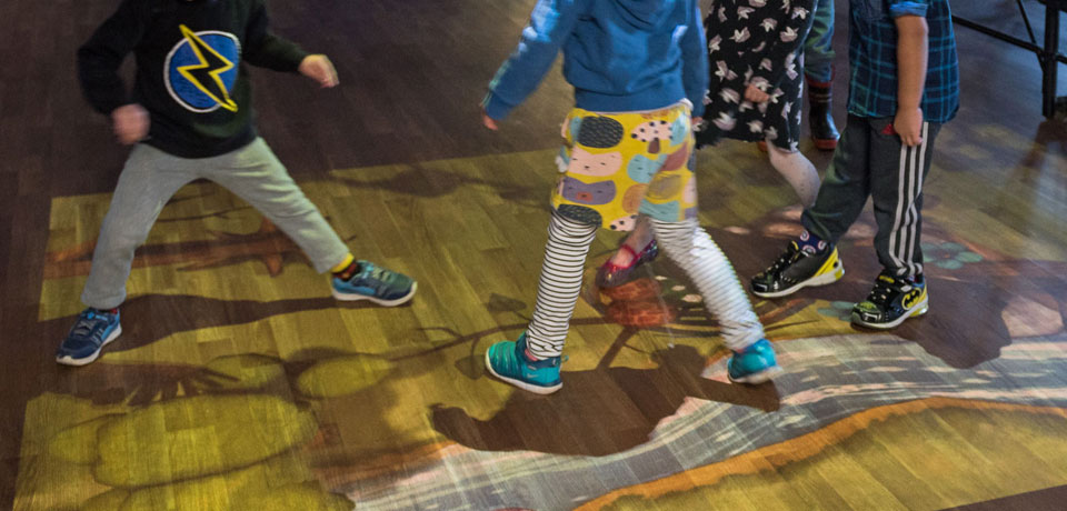 當(dāng)孩子走至投影區(qū)域時(shí),通過(guò)系統(tǒng)識(shí)別,參訪者可以直接使用雙腳或動(dòng)作與投影幕上的虛擬場(chǎng)景進(jìn)行交互,各種互動(dòng)效果會(huì)隨著孩子的腳步產(chǎn)生相應(yīng)的變幻,讓人進(jìn)入一種虛實(shí)融合、亦真亦幻的奇妙世界。