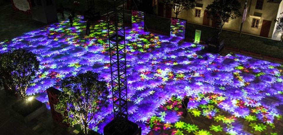 體驗者走過的位置會有出現(xiàn)大小不一的花朵,花朵從較初的花苞逐漸生長成完全盛開的狀態(tài),當(dāng)體驗者再次踩到盛開的花朵上時花朵會散落成花瓣,從生長到凋謝跟體驗者產(chǎn)生一連串的互動。