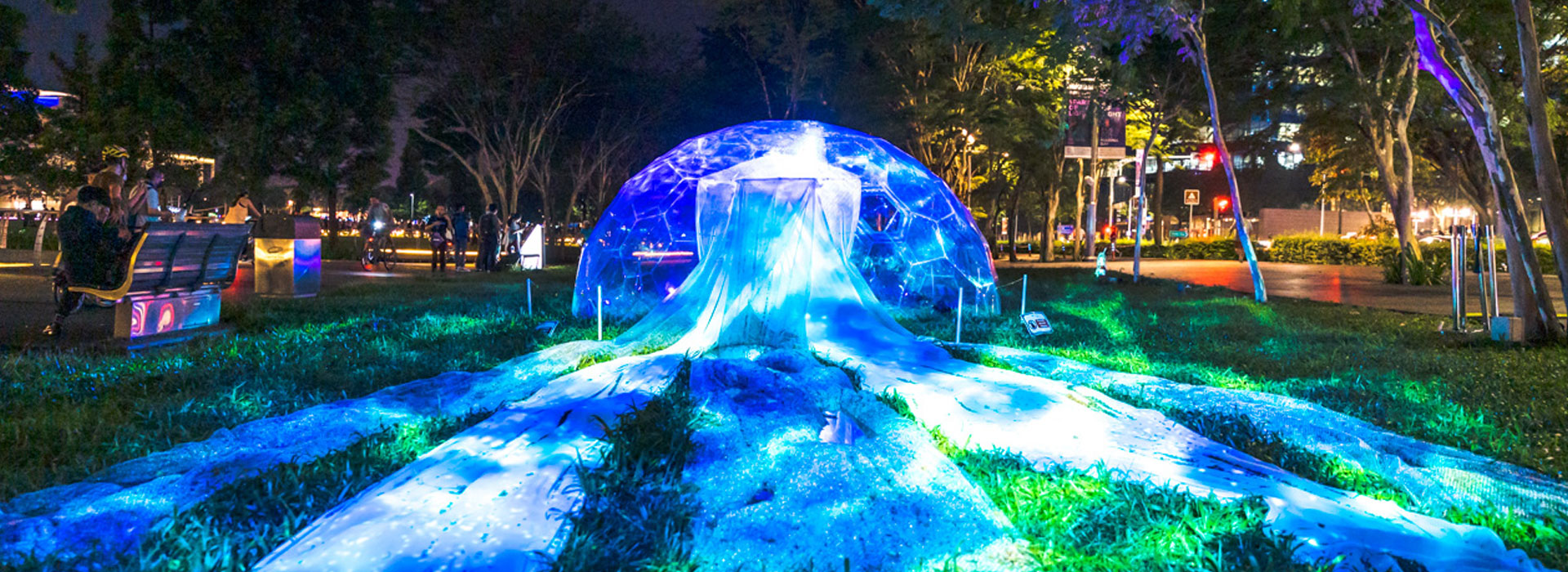 在某區(qū)域利用燈光布置營(yíng)造出星星點(diǎn)點(diǎn)的螢火蟲森林的奇境。
