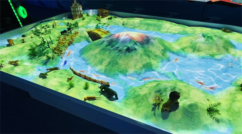 從娛樂(lè)項(xiàng)目上來(lái)看,沉浸式互動(dòng)兒童樂(lè)園和傳統(tǒng)兒童樂(lè)園并沒(méi)有大的差異,當(dāng)然這里指的是項(xiàng)目本身,兩者之間從互動(dòng)體驗(yàn)、視覺(jué)感受、科技形態(tài)上來(lái)說(shuō)有天壤之別。我們以互動(dòng)沙桌為例,傳統(tǒng)的互動(dòng)沙桌無(wú)非是利用沙子堆積建造、人物。在沉浸式互動(dòng)兒童樂(lè)園內(nèi),互動(dòng)沙桌通過(guò)融入全息互動(dòng)投影技術(shù),沙子高低的變化,能在沙桌內(nèi)形成火山噴發(fā)、河水流動(dòng)、森林等場(chǎng)景。
