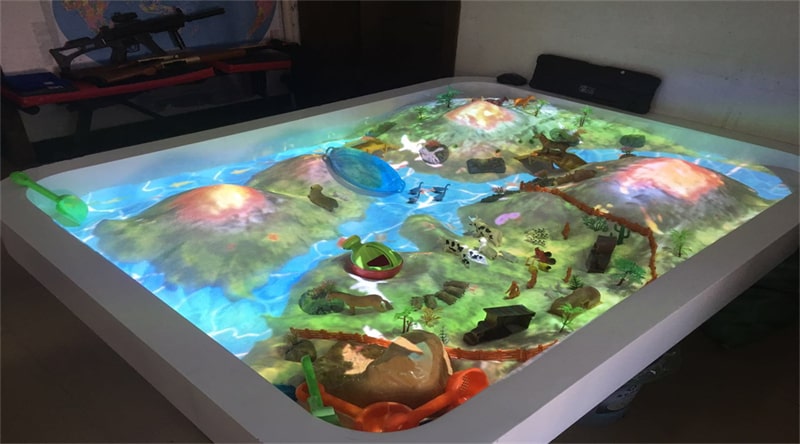 和傳統(tǒng)沙坑相比,互動沙桌在視覺體驗上更具吸引力。通過撥動沙子的位置、高低,形狀的變化會帶來場景視覺的更換,堆砌高山即可形成火山噴發(fā)的場景、挖溝即可形成河流海灘,與互動游戲結(jié)合,打造尋寶、互動、視覺體驗為一體的沉浸式空間。