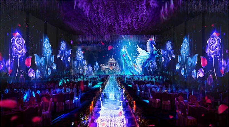 和傳統(tǒng)宴會(huì)廳相比,全息光影宴會(huì)廳的主題場(chǎng)景對(duì)年輕消費(fèi)群更具吸引力,數(shù)百套主題場(chǎng)景,包含浪漫花海、森林城堡、星空海洋等。支持多空間、多場(chǎng)景分別配置、自由切換,可以承載更多需求類型的用戶群,提升營業(yè)額。