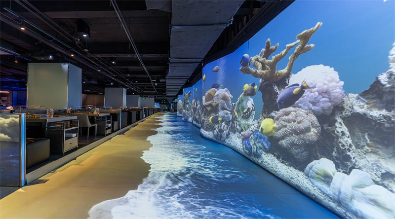 畫(huà)畫(huà)水族館:作為互動(dòng)兒童樂(lè)園較為受歡迎的應(yīng)用,其應(yīng)用技術(shù)形態(tài)是將墻面投影與掃描設(shè)備融合,孩童通過(guò)在特制的繪板上進(jìn)行創(chuàng)作,通過(guò)掃描儀將隨筆畫(huà)投射在墻面投影打造的虛擬海景場(chǎng)景內(nèi),產(chǎn)生虛擬形象,孩童可以與虛擬形象產(chǎn)生互動(dòng),趣味性十足。