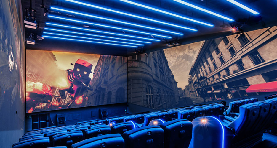 沉浸式影院又稱“CAVE系統(tǒng)” ,通過多臺投影機(jī)投射在四面墻、天幕以及地面,構(gòu)造出一個立體空間,讓觀眾沉浸其中,仿佛穿越到現(xiàn)場。